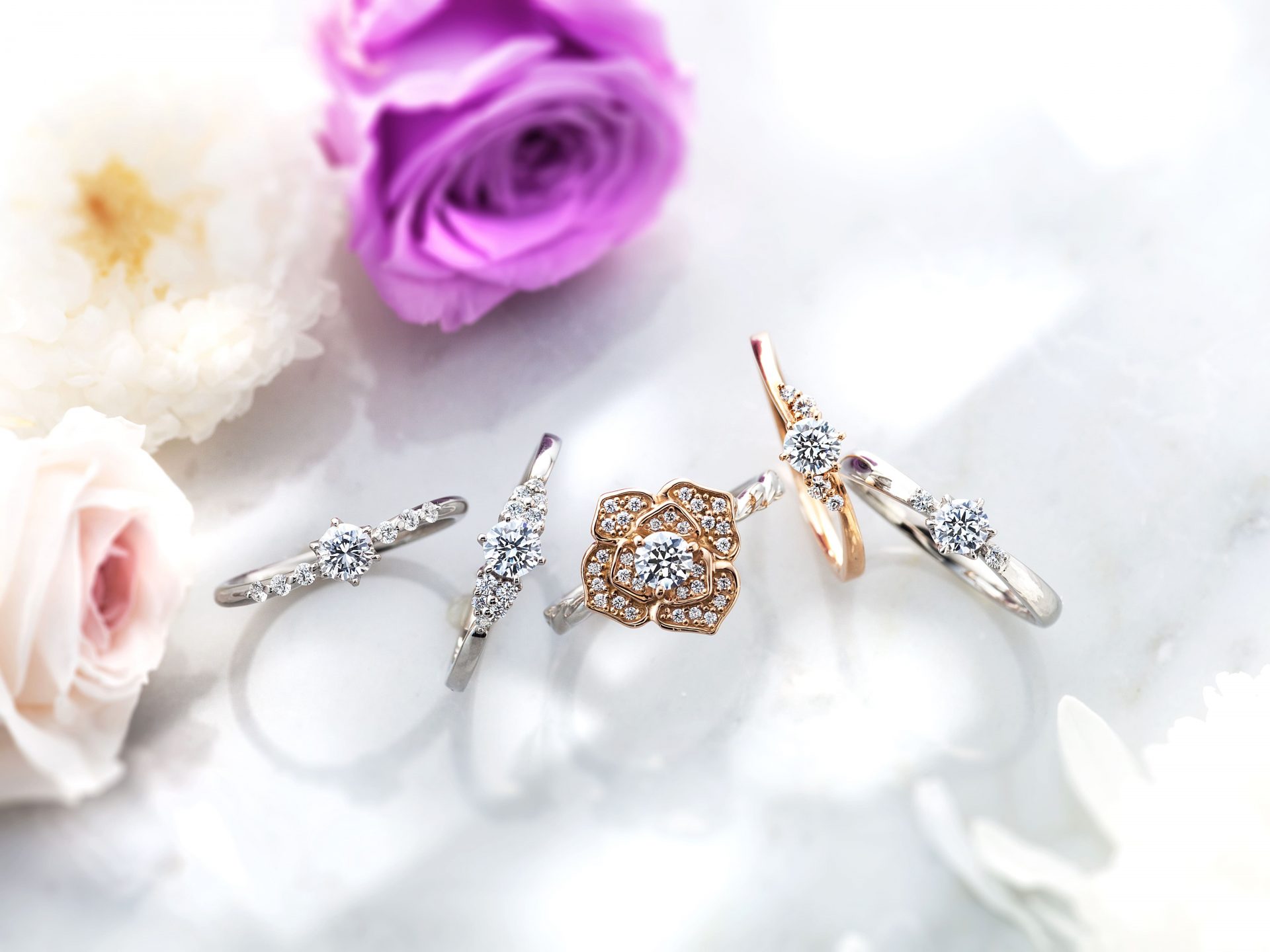 細身で華奢なシルエットと可愛らしい雰囲気が魅力です。シンプルながらもロマンチックなモチーフを取り入れたデザインが多く、婚約指輪と結婚指輪を重ね着けしてもバランス良く見えるように設計されています。 代表的なモデルには、バラをモチーフにした「ローズアブソリュート」などがあり、中央のダイヤモンドを花びらのようなデザインで包み込む華やかなリングが特徴です。こうした花をイメージしたデザインは、女性らしいエレガントさと華やかさを表現しています。